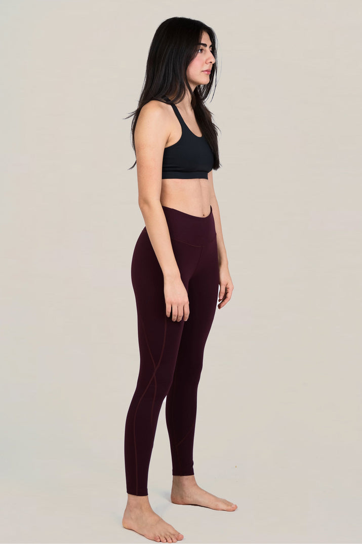 Answer 3: The leggings have a high-waisted design with a V shaped waistband that offers excellent shaping without inner elastic, providing comfort and coverage. The model is 5'7" and wears a size small, and the leggings are available in various sizes to accommodate different body types.